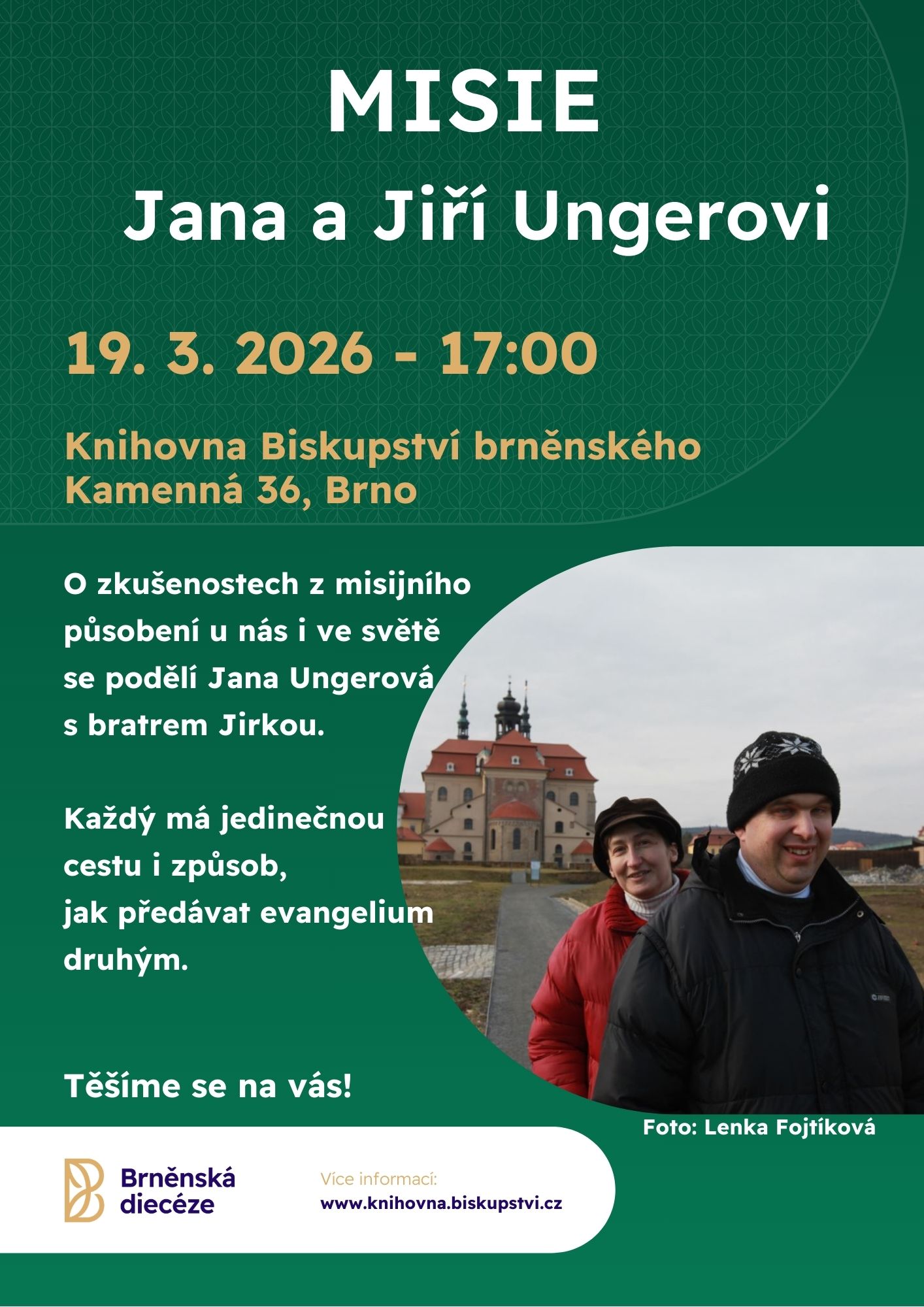 Misionářka, spisovatelka a překladatelka Jana Ungerová vyprávěla o své životní cestě, Božím vedení a zkušenostech z misijní školy či působení v misiích. Spolu se svým bratrem Jirkou jsou sehraná dvojice misionářů, z nichž jeden mluví a jedná, druhý drží modlitební stráž.